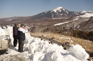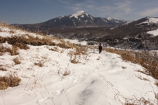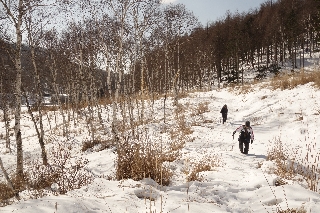 | 諏訪隠(霧ヶ峰) ロッジの周りには、この冬まったくといっていいほど雪がない。2月の初めに夜じゅう雨が降って、真冬の、それも夜の雨なんて最近の現象で、かつては真冬の雨なんてなかったように思う。降れば必ず雪だった。 それでもさすがに標高が1500m以上ともなれば雪だったらしく、1月中にはほとんど雪の見えなかった霧ヶ峰もそこそこ白くなっていた。ここのところたわらさんの写真を整理して、カボッチョのスノーシューを懐かしく見ていたから、一度くらいは雪を見に行くのもいいだろうと木曜山行での計画を考えた。 6年ぶりにカボッチョでスノーシューとも思ったが、さすがにあれだけ全山が白くなるほどの雪ではなかろうし、そうならやはり前のほうが良かったなと思うだろうから癪である。そこで、スノーシューを履くほど大げさではなさそうな諏訪隠を目的地にした。 諏訪隠(すわがくし)の名前は昭文社の地図によるが、その監修者の手塚宗求氏の著作によると、現在の車山高原スキー場一帯の草原を諏訪隠と呼んでいたらしい。大門峠あたりから見たとき、諏訪方向に立ちはだかる稜線とでもいう意味であろうか。ここで言うのはその先端部分である。 車で行けるところまで行けば散歩にもならない諏訪隠だから白樺湖畔からの周回コースを設定した。しかし無雪期なら軽い山歩きにしかならないその設定が災いして、結局、目的地まで届かなかった。要するにまったく人の歩いていない雪にトレースをつけなければならなかったうえに、その雪の状態も悪すぎた。標高差100m足らずを登るのに1時間かかる始末で、登るには登れても、下りで相当な苦労をするだろうと、昼飯を食べたところで早々とあきらめて下山することにした。中高年隊はあきらめが早いのである。 スカッとした青空に白き山々の展望も満喫したし、まあ上出来としましょう。 |