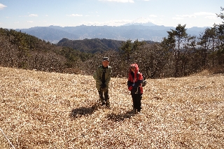 | 帯那山(甲府北部) 20年近くも続いている木曜山行は、県内の日帰りで行ける範囲のめぼしい山のほとんどに足跡を残している。自分自身も参加者も年齢を重ねているので、数年前からは「健康」の文字を加えて、無理をしないような山行が主眼となっている。となると選択肢はせばまって、前に行った山でもまた行きましょうとなる。 帯那山には手を変え品を変え何度となく登って、前回は2年前だし、太良峠は去年の11月に歩いたばかりだから、もうおなじみ過ぎるくらいの山域だが、地元のHさんが未踏だというので計画してみたら、当のHさんの都合もつき、この山の身上の展望も満喫できたのだから幸いだった。寒い日ではあったが、日当たりのいい草原にいる分にはゆっくりと過ごすことができた。 たった2年でも様子は変っていて、頂上一帯の原には何基もの新しいベンチがしつらえてあった。アヤメの時季にでも来ればそれなりの人出があるのだろう。山頂南にある石祠は2年前に倒れていたのを起したのが、今回もまた倒れていた。数メートル上の大木の根元に礎石が残っているから、そこから落下したのだろうが、ひとりでそこまで運ぶには力が足りない。そこで落ちている場所に立て直したのだったが、地面が安定していないからまた倒れたのだと思う。また起こしておいたが次に来るまで倒れないでいるだろうか。文化十年と彫られているから、当時にはこの山奥へと多くの人が仕事に入っていたのだろう。実際、大正初期の地図を見ても、太良峠や帯那山の周辺にはおびただしいほどの破線が入っているのである。 電波塔付近の伐採はほぼ終了したらしく、殺伐とはしているものの甲府盆地の東から南にかけての展望はすばらしい。あと5年くらいは大観が得られるだろう。 2年前とまったく同じ、太良峠を基点にする周回コースは、歩きやすさや展望の面で、冬の第一級のハイキングコースだと思う。冬ならではの静けさがまたよろしい。昨日もハイカーは皆無であった。 |