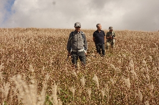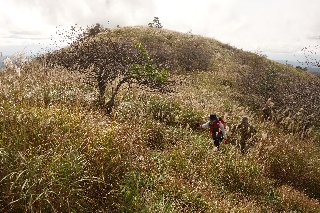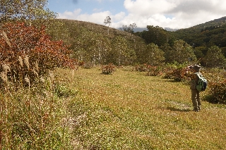 スキー場まで車を使えばものの15分で達してしまうが、それはいずれ最後の手段として、前回と同じく白樺湖畔を出発点とした。ビーナスラインから下部の道形ははっきりとしないが、雪に較べればススキを分けて登るくらいは何ということもなく、前回の半分の時間もかからなかった。