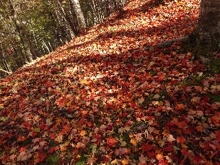 秋には紅葉狩りでにぎわう本谷川よりは、誰もおらず、自由に歩ける広い河原のある天鳥川沿いの林が私は好きで、そこを歩くのも楽しみにしていたが、錦秋というには少々時期が遅かった。しかし地面に落ちた葉がまだまだ色を残しているのが美しい。落葉松の色も輝かしいとは言えないものの、それはそれで今年の色だと思えばよい。