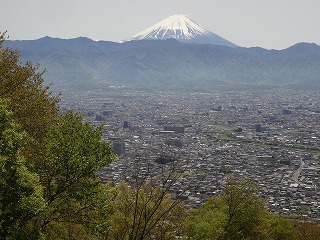 片山に登る人でもこの道を登ろうとする人はまずめったにいないだろうという北側の登路である。頂上に着くまでひとりにも出逢わなかった。予想どおり山桜はすでに葉桜だったが、カエデは今しも新緑の盛りだった。夜半まで降っていた雨が塵を洗って、見おろす甲府の街も富士山もくっきりとしている。