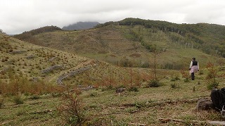 | フシノソリ(御所平) さて今週の木曜はどこを歩こうかなと考えあぐねているうちに前日の夕方になってしまった。参加者は毎度のおとみ山だけなので、そういつもいつも霧ヶ峰方面でもなあと悩んだのである。 お泊りになっていたご常連の山猛者、Kさんに明日はどこに行くのですかと聞くと、御陵山あたりを探ってみるというので、9月に計画して流れたフシノソリを思い出した。あそこなら行く方向がほぼ同じなので、小海線を使うつもりだったKさんを車で送っていける。 Kさんにそう言うと、じゃあ私もフシノソリへ一緒に行きますとなってしまった。信州峠以東の小川山に至る甲信県境稜線はまだ歩いていないという。我々の計画では物足りないだろう、軽い散歩のような山ですよと念を押した。 5年前に黒森から登ったフシノソリだが、高登谷高原からは14年ぶりだからご無沙汰したものである。出発点の溜池の周りも、あったはずの建物がなくなっていたし、何より、溜池の向こうに見える県境稜線が伐採で丸裸になっているのには驚かされた。5年前にもすでに伐採されていたのがさらに拡大していた。 ハナイグチ、クリタケ、ヌメリスギタケモドキ、チャナメツムタケと収穫しながらの山散歩であった。かつてはあった県境稜線南側の展望は、植林が成長してほとんどなくなっていた。山も十年ひと昔である。 伐採地に出るとあとは溜池に向かって下るのみである。眺めのいい場所で飯を食うのがいいだろうと少々早い昼休みとした。石コツの上まで伐採されているので、信州峠へ向かうなら、これまでにはなかった展望が楽しめるだろう。 溜池のまわりで再びキノコ狩りをして、その収穫はむろん夕方の食事となった。 |