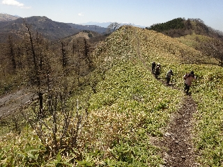 | 三峰山(霧ヶ峰・和田) 冷たい大雨の翌日、おそらく春には珍しい透き通った空になるだろう。この好機を生かさなければと思案した。なにしろ、わざわざ遠路をおいでの方々ばかり、名古屋のやまんばさんは先週に引き続き連続で、神戸のNさん、そしてNさんの娘さんは、なんとロサンゼルスから久しぶりに帰国しての初参加なのである。 予想どおりの、まるで冬の朝のような空になった。高い山山は新雪で白くなっている。行先は、先週全通したばかりのビーナスラインを使っての三峰山と決まった。諸事情を勘案し、これまでとはちょっと違った行程とする。 そして大当たりの三峰山日和、四囲の山々はくっきりすっきり、雲に隠れていたのは、とおく北アルプス北部のみであった。 このあたりまで来ると、近い北アルプスに目が行きがちだけれど、よくよく見るとこの方角からの南アルプスの並びの良さは相当なもので、白峰四山とも言いたい、それぞれの個性がある。 ときおり吹く風も肌に心地よい。静かな頂上で豪華な眺めをひとしきり楽しんだ。 |