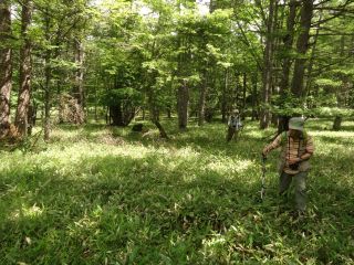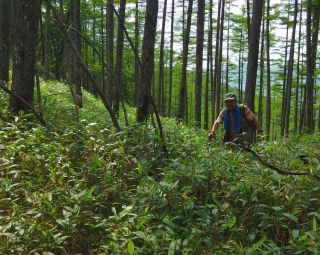 | 星ヶ塔(霧ヶ峰) 「星ヶ塔」という印象的な名前は、手塚宗求さんが監修していた昭文社の地図にあったので知っていた。国土地理院の地形図には記載はない。昭文社の地図は縮尺が大きいので、だいたいの位置しかわからないが、地形図と照らし合わせると、この突起をそう呼ぶのだろうなとわかる。 下諏訪町の説明は以下である。 -------------------------------------------------------- 星ヶ塔遺跡を発見した鳥居龍蔵によれば、星ヶ塔はもともと「ホシノトウゲ」と呼ばれていたようです。星ヶ塔遺跡の東側は、鷲ヶ峰の山裾と星ヶ塔山の間のへこんだ部分であり、山道の峠になっています。この峠に「ホシ」があることからホシノトウゲと呼ばれていたのですが、昔の人々は黒曜石のことを夜空に輝く星のかけらと考え「ホシクソ」と呼んでおり、そのホシクソが峠道にたくさんあることから「ホシノトウゲ」という地名がつけられました。のちにそれがホシノトウ、そして「ホシガトウ」と呼ばれるようになり、その後漢字が当てられ、現在の「星ヶ塔」と表記されるようになりました。 -------------------------------------------------------- 要するに星ヶ塔は峠のことだから、その西の突起は「星ヶ塔山」とでもするのが正しかろうが、「塔」なんて山らしい漢字が充てられているのにわざわざ山をつけることもあるまい。 さて、避暑の山としては霧ヶ峰は最高だけれども、目新しいところはそう残っていない。先週の冷山に引き続き、黒耀石ついでと、この星ヶ塔に登ってみることにした。 この山、中山道側の星ヶ塔林道をたどればわけないが、この林道は歩行者といえども通行禁止という林道だから歩きたくないし、面白くもない。つまりは、国史跡の黒耀石採掘地には許可なく入るなということである。もっとも我々は山のてっぺんに立ちたいだけで、採掘地を見る気など最初からない。2年前、NHKの「ぶらタモリ」でこの採掘地が紹介され、いっときよく知られることになったらしい。 そこで別の方法を考えて(行程は各々が想像すればいいので略す)、これで楽勝だ、午後早いうちには戻れるだろうと思ったのは浅はかだった。頂上には無事立ったものの、近来ないヤブ漕ぎの連続と、長時間行動になってしまった。歩けると思っていた径は踏跡以下で発見すらできないのも多く、逆に地形図にない作業道は縦横にあって惑わされたり遠回りさせられる。ヤブの中ではカメラとストックを失うという体たらくで、標高1600m近い場所といっても暑さで大汗もかかされて足は痙攣するし、ほうほうの体で出発点に戻ったときにはすでに夕暮れていた。 道中いたるところに転がっていた黒耀石については、これまでに見た中で最大の量で質も最高だと思われた。しかし、刃物がわりにしたといっても、それだけのために、全国からこんな山奥まで縄文人は訪れたのだろうか。 それにしてもおとみ山、この行程をこなしたとは、お達者というどころではなく、異常だと思われる。 |