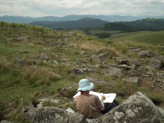 頂上では、3年前に登ったときに工事が始まっていた展望テラスが完成していた。頂上に居る間には、その広いテラスが無人になってしまったこともあったのだから、夏の終わりでさすがに人出も少なくなっていたのだと思う。2時間もいれば光線が変わって、北アルプスは遠くなり、八ヶ岳がくっきりとしてきた。すがぬまさんは方角を変えてスケッチである。