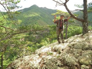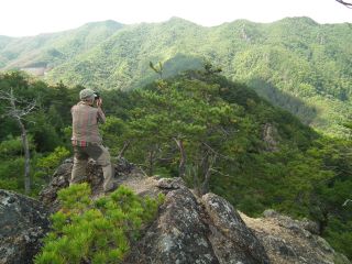わりと広い西ピークは羅漢寺山あたりに似た白砂青松で眺めがよい。昼にはまだ間があるので、東ピークで昼食にすることにする。ピーク間にはシャクナゲが多いので花期には見事だろう。
