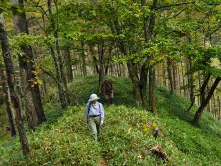 せいぜい膝下くらいの笹を分けて急に下ると明確な踏跡が現れた。人通りよりは鹿通りがほとんどだろう。いたるところに鹿の寝床がある。