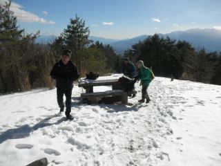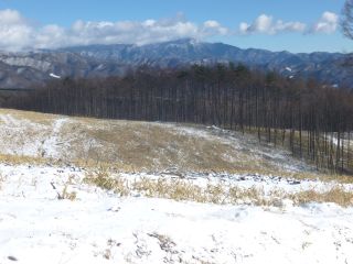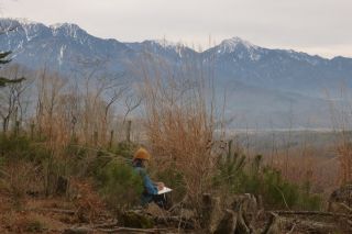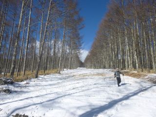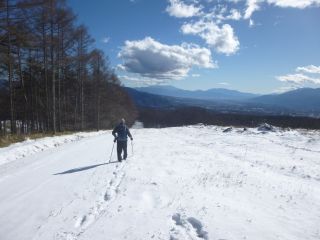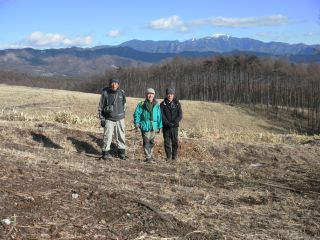 伐採地の上部まで登らずとも、林道からの眺めはすばらしい。あいにく、山々がすっきりと見られる日ではなかったが、想像はできる。それにしても、まるで3月のような陽気で、前週の八ヶ岳横断歩道での寒さがウソのようである。風が吹くと気持ちがいい。