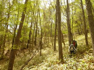 それで、下るつもりでいた急斜面のルートを変更し、少々遠回りでも傾斜の緩い山腹を下ることにした。とはいっても道などない。こんなところを歩くのは初めてであろう。