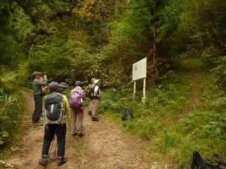 遠まわりして三味線滝に着いたら、もう今日はこれで十分だとご隠居さんが言うので、観音平まで行くつもりだったのをやめて、笹に埋もれた旧道を下った。
