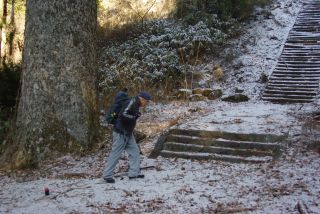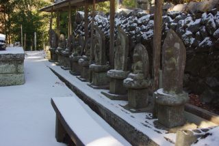 うっすらと雪が積もった、人っ子ひとりいない海岸寺。鹿道を拾ってその裏山の海岸寺山に着くと小さな石祠がある。源太ヶ城山への林道は、もう久しく車が通らなくなって、落葉でふかふかになっている。
