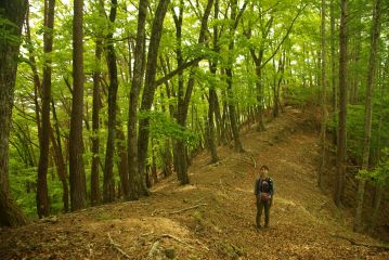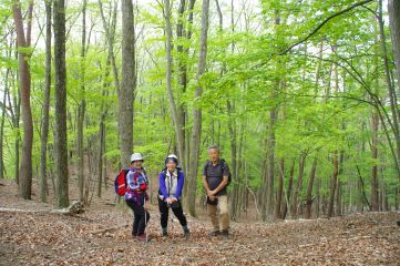 そして、肝心の尾根歩きは当然ながらすばらしかった。「ほとんど奇跡のような」と前回表現したのがあながち大げさではないと、参加された方々も感じたことだろうと思う。地面の柔らかさ、樹林の良さ、そして何より圧倒的な静けさ、さらには歴史的価値。登るにつれて緑の色が淡くなっていき、ところどころでその中にヤマツツジの濃い橙が映える。