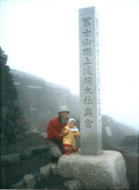 外へ出ると、相変わらずの霧と風。〈冨士山頂上淺間大社奥宮〉の石柱の前で記念写真を撮る。最高点の剣ヶ峰へは行けなかったので、ここで渓の富士山への挨拶とさせてもらう。御坂峠からいつも見ている富士山の頂上はここなのだから、まあ、いいだろう。この写真はあとで現像したら今時珍しいピンボケだった。オートフォーカスのコンパクトカメラは、霧があるとうまくピントが合わないことがあるようだ。