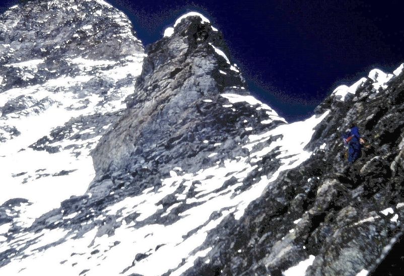 | 右上に黒いツルムが迫る。夏とは思えないヘルンリの雪景色(1978年7月上旬) ウィンパーといえばマッターホルン。その栄光と悲劇があまりにも有名な一方で『アルプス登攀記』の読者以外には、彼のあのひと夏は意外に知られていない。それが1865年6月16日のグラン・コルニエに始まり、ダン・ブランシュ、グランドジョラス(ウィンパー・ピーク)、ヴェルト針峰、リュイネット、そして7月14日のマッターホルン登頂に至る一連の山行だ。ダン・ブランシュはひどいコンディション下での第3登だが、それ以外はすべて初登頂。その間にもドランのコルのアルジャンチエール側への困難な下降やタレーフルのコルの横断ルート開拓など、すべては足だけの移動手段で達成された。ちなみにダン・ブランシュとヴェルトは、今ではマッターホルンのヘルンリよりハイレベルな登山として位置付けられているし、装備も貧弱でヴェルトのウィンパー・クーロワールは氷を避けて右側を鋲靴で登っている。いずれも、この時代ならではの傑出した山登りの代表格にあげられる。マッターホルンのドラマの陰で忘れ去られるには惜しい、それは疾風怒濤の一か月だった。 若いころの私が変な壁登りに毒されていなければ、ウィンパーのあの夏の偉大な足跡をたどる「シックス・サミッツ」に挑戦できたかもしれなかった。80年代以降の私はエコ的世界観と出合い、必要以上に化石燃料に依存しない生き方を選んで、完全に海外の山とは縁を切った。ここに紹介するエピソードは、それ以前の気軽にアルプス行を楽しんでいた時代のひとコマである。 約10日間のドライブ旅行で山に使う日程はわずか2日半、付録の山は、うまくいけば儲けものだった。パリで慣れない環状線の出口を探しあぐね、二回りしてから南へ向かうアウトバーンに乗り、夕方、マコンに宿をとる。そこはあのコートドールのど真ん中。酔っ払いが舌なめずりしそうな土地だが、ワインには未熟者だった私は、宿近くの酒屋で勧められるままに赤白2本をあてがわれた。その片方の赤が、初めて口にするヴォージョレだった。この地で名高いピノ・ノワールならぬガメイ種のブドウで作られた普及品だが、私たちには旅のスタートを祝す甘露の一杯だった。 山以外の旅の記憶はおぼろげだ。アンシー湖の畔で山盛りのワカサギの唐揚げを食べ、シャモニからトンネルを抜けてアオスタへ。ミラノは素通りし、レッコ湖畔を北上、キャベンナからマローヤ峠を越えてクール。さらにオーベルアルプを越えてローヌの谷に入り、テッシュに車を置いてツェルマット。そそくさとヘルンリへの雪道を登ったものの、小屋は開店休業。7月のシーズンを迎えたばかりだが、雪が多過ぎてガイドたちが客の案内を断っているのだ。 翌朝は暗い中をKと二人で小屋からアイゼンを装着して出発。唯一同宿のスコットランドからやってきた学生二人組のライトが上方に点滅している。ヘルンリは初めてだが、薄暗な中、雪のおかげでルートはよく分かる。やがて日が昇って白銀の世界に一転、登攀記の「マッターホルンの初登攀」の章冒頭のツェルマット出発の朝の情景brilliant morning(輝ける朝)を思い出す。東壁側のミックス地帯をぐんぐん登っていくと、黒いツルムを右手に見上げるあたりで前を行く二人に追いついた。 このあたりから登路は不明瞭になり、彼等は岩が露出している北東稜側へ向かう。私たちはツルムの直下をめざしてミックス地帯をまっすぐに進んだ。落石のリスクはあるが早く行けそうだし、彼等の前へ出ればとりあえず石は落ちてこない。しかし、事が順調に運んだのはここまでだった。突然、カランカランという落石の音とともに目の前を人が転げ落ちていく。すぐにロープが伸びきりパートナーが巻き込まれるかに見えた。ところが途中でロープが岩に絡んだのか、転落は止まった。 奇跡としかいいようがない。驚いたことに、落ちた当人が登り返してくる。見た限り外傷はなさそうだが、ショックが大き過ぎて痛みの感覚が追いつかないことはよくある。転落したのは180センチはゆうにある巨漢で、名前も忘れてしまったので仮にジャンボと呼ぼう。彼はピッケルと片方のアイゼン、それにミトンを一組失った。体温は指先から奪われるからすぐにミトンを与えて温める。 ![]() 右上の北東稜寄りの岩場をジャンボが登っている。このあとアクシデントが発生する ジャンボはロープで確保してやれば、なんとか自力で歩くことができた。ここからヘルンリ小屋手前の安全地帯までは、北東稜からの低い側稜をいくつかまたぎ越していく。途中一カ所、氷化した狭いバンドがあったが、ここさえ無事に通過できれば、彼も生きて帰れる。ジャンボのパートナーは無事だったので先行してもらい、私とKのロープの間にジャンボを入れてすぐ下山にかかった。 転落でダメージを受けているはずの彼は、ロープに支えられて順調に下りていく。そして、問題の箇所である。先行する