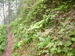 | 何と言ったって1700メートルまで車で登ってしまうのだから、あとはせいぜいのんびりやろう。だが、まてよ。櫛形山には、登る予定ではなかったけれども、すぐ近所なのでひとつやっつけちゃうか。と貧乏症を発揮させるのが、マイカーで行く大峠山、源氏山である。タクシーを使った場合は、十谷温泉に下ること必定なので、つまらぬ考えは起こさずにすむ。 丸山林道は池の茶屋林道分岐までは、ほぼ全舗装である。源氏山登山口は、その分岐からわずか奈良田寄りにあるが、なんの標識もないし、車を置くスペースもろくにないので、馬鹿げた公園を作っている池の茶屋跡付近に車を置いて、歩いていったほうがよいだろう。 入口からは尾根の西側につけられた径を南へ南へと歩いていった。あいにくの薄曇りで、当然見えるはずの景色が何も見えない。豊富な水量の水場を過ぎ、巨大なツバメオモトが咲くなかを大峠山への分岐に着いた。 ここからまず大峠山をピストンする。径は少し薄くなるが、大峠山の北から東に回り込んで直登わずかで、三角点のある頂上である。疎林越しに、晴れていればある程度の展望はあるだろうが、今日は何も見えない。滞在わずかで引き返す。 源氏山へは、分岐から一度下ってから、登り返す。かなり大きな伐採小屋の廃屋を過ぎる頃から、この辺り特有の、白い花をつけるヤマイワカガミが多い。ここからわずかの登りで、伐採を逃れ、昼なお暗い原生林に囲まれた源氏山頂上に着いた。写真を撮って、すぐに下る。頂上の登りに入る所が明るく開けていたので、そこで昼食。しばらくのんびりしたあと、往路を戻った。 1993年6月18日 国道52号(20キロ弱)登山口(25分)水場(35分)大峠山分岐(大峠山往復40分)分岐(30分)源氏山(1時間25分)登山口 二万五千分の一地形図=奈良田、鰍沢 アドバイス 晴れていれば、富士や南アルプスの眺められる楽しいハイキング。また、帰りは奈良田へでも寄って、ひと風呂浴びて、白旗史朗山岳写真館でも見たいものだが、丸山林道はこの先は悪路。ジープタイプの車でもない限りやめたほうが無難。十谷温泉に下る場合は、源氏山直下の廃屋のある所が分岐になっている。行程約3時間半。 |