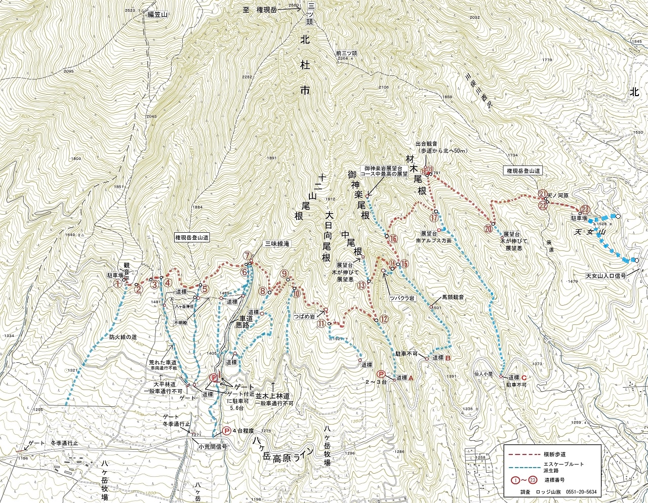 観音平(60分)F三味線滝(60分)J大日向尾根(50分)N御神楽尾根(50分)P材木尾根(40分)S東材木尾根(30分)天女山駐車場