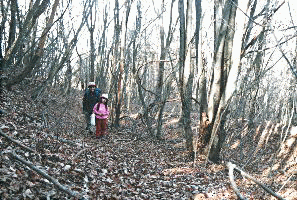 | かつては木を曳いたのだろう、尾根を深くえぐった径さえも埋めてしまいそうなくらいの落ち葉をラッセルしながら親子とおぼしき三人連れがいく。父親は先行して径を確かめながら進み、母親と娘はそんな面倒な作業は父親にまかせたとばかり、しごくゆっくりと後をついていく。幼子にとっては、ときには腰まで埋まるような落ち葉の吹きだまりもある。 甲州はつい先ごろ笛吹市となった境川藤垈の在、滝戸山から北に延びる尾根がこの集落に突き当たる直前、わりと鋭くとんがった小山を起す。私はその頂上にある金刀比羅神社の狛犬である。 この正月のことだ。元旦こそ村人でいっときにぎわったものの、二日になればまず人など来ないのが常である。今では神社の南側を越える車道があるから、歩いて参拝に来るものなどさらにない。 無聊をかこっていたら、その車道を歩いて登ってくるものがいる。就学前の幼児とみえる娘をひとり連れた夫婦のようだ。さては正月早々人知れず一家心中でもするのか。だが見れば登山の格好だし、これが初詣となるのだろう、殊勝にも母娘は手を合わせて賽銭まで投げた。一方父親は「おお、白峰三山だ」と歓声を上げて、参拝する暇などあらばこそ、罰当たりにも拝殿に尻をむけて山を撮るのに忙しい。この父親を見れば今から死のうという家族とはとても思えない。滝戸山にでも登ろうというわけだろうが、正月早々こんな山にしかも幼児連れで登ろうという家族があるものだろうか。よし、暇にまかせて今日はこの妙な家族の様子をみてやろうと、神社から北へと尾根を登りだした三人に気づかれぬように後を追ったのが冒頭のくだりというわけである。 かつてはよほどの物好きが登るだけだった滝戸山は、立派な車道が近くを越えたり、山梨百名山に選ばれたりして大出世をとげた。今では道標完備である。たぶん入山者も増えたことだろう。しかし、それも車道が使えて最短距離で登れる季節だけ、道標もそちら側にしかない。私の神社から手間ひまをかけて登るものなどいったい年間何人いることだろう。 どうもこの父親は山がにぎやかになるのは山の堕落だと苦々しく感じている口ぶりだが、山が自分勝手に堕落するはずがない。山のせいにしてもらっては困る。この世で堕落するのは人間だけだ。神に仕える身にはよくわかる。 尾根径はいったん林道を横切る。そのすぐ先にある狢山の三角点を、父親はうろうろと捜しまわっている。三角点を見つけたらどうだっていうのだ。偏執狂なのか。 尾根がせばまるとあたりは葉を落としきった広葉樹の明るい林となる。父親はうっとりして、森はこうでなきゃいけないと力説するが、森がよければ腹でも膨れるのかといった顔で父親を見る母娘である。女子供には困ったものだと連れている犬に同意を求める父親が哀れだ。 かろうじてあった踏跡も、頂上直下で尾根が山腹に吸収されると定かではなくなった。高いところへ行きゃ頂上だと父親は突進する。幼子のためにもう少し歩きやすいところを行けばいいのに、そんな配慮はこの男にはないようだ。もっとも、それがあるならこんなところに最初から来まい。 滝戸山のてっぺんまで来るのは私も久しぶりだったが、三角点の横には山梨百名山の標識が誇らしげに立っている。私は地元だから小声で言うが、もっとふさわしい山が他にありそうにも思う。 家族は頂上で昼食をすませると鶯宿峠へと出発した。薄い踏跡を追った昔はどこへやら、立派な径が車道の乗越す現在の鶯宿峠へと続く。峠は公園風に整備され、ベンチもある。車で来られるところでこれだけの大観はめったにあるものではない。甲府盆地をめぐる名だたる山々が一望のもとだ。 旧鶯宿峠への尾根筋を分断し新しい林道が開通している。父親は何だこれはと文句を言いながら歩いていくが、私にもさすがにその気持ちはわかる。新しい林道を歩いてたどりついた旧鶯宿峠は、なんじゃもんじゃの木こそ以前と同じに立ってはいるが、まるで昔日の面影はない。家族はここから下ろうと径をさがす。なるほどこの峠径を下って周遊するつもりか。ところが大窪へ下る峠径もまた違う林道で寸断されている。父親はあくまで峠径にこだわって強引に薮に入るが、そんなのは真平ごめんと林道を歩いて下った母娘の方が結局早い。あきらめて父親も林道に降り立つ。やがて尾根筋についた林道が突然終わり、かつての峠径が境川の源流へと下っていた。もはや往来はほとんどなさそうな荒れた径、途中、苔むした古い観音様が往時を偲ばせたが、思えば私はこの石仏とは幼なじみだ。お互い随分年をとったものだなあ。 人の径はやがて荒れた林道となって、さらに舗装路と合流、そこに家族の車があった。奇妙な名前の屋号が書いあって、宿を営んでいるとみえる。正月に遊んでいるとはよほど盛らない宿らしいな。 変な家族だが、一日一緒にいて何やら情も移った。娘はよく歩いたものだ。また来いよ。