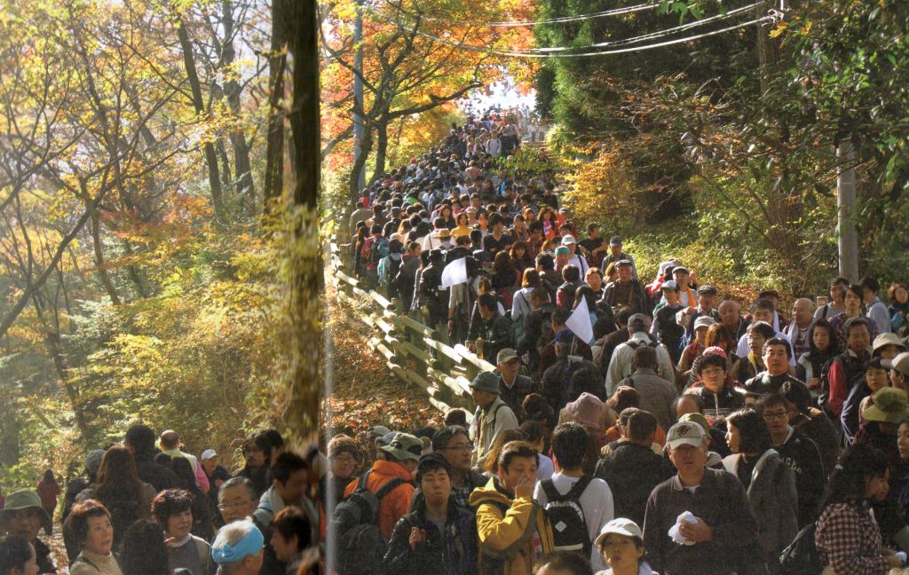 高尾山の1日の最高登山者数が74359人だったと伝える、『山と溪谷』2011年1月号に載った写真