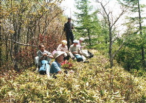 最初にこの山に登ったのはもう十年以上も前で、そのときは和田峠から鷲ヶ峰、八島湿原をへて白樺湖まで歩く長丁場の日帰りだった。その後、03年の初秋、ロッジ泊の二日目は快晴に恵まれ、オーナー、すなわち長沢君同道で八島高原駐車場から往復した。道々で見下ろす八島ヶ原湿原、遠くの沖天には八ヶ岳や南アルプスの眺めがすばらしかった。鷲ヶ峰だけではあまり時間はかからなかったので、さらに天望台に車をすすめ三峰山(1887・4m)を再訪した。三峰山も私好みの山だ。 |