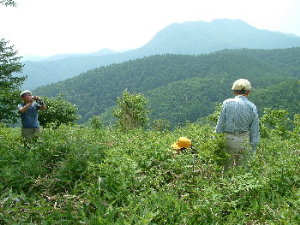 その昔、日本武尊が越えたといい、地形図でその峠道の破線を見るたびに、どんな峠かと長く憧れていたのが、つい先日(05・5)、この目で見てくることができた。最寄り駅は小海線の佐久広瀬だからなかなか行きにくい峠で、やはり長沢君の車に乗せてもらってこそである。ところが実際にいってみれば、道は消え、急斜面をやみくもに登るはめになった。また、登りついた峠そのものも落葉松林のなかのこれといって特徴のない尾根上であり、古びた由緒書のブリキ板が一枚が木に打ちつけてあるだけだったが、長年の望みがたっせられ、私は嬉しかった。ただし、私のような思い入れのない人にはけっしてお勧めはしない。「なんだ、こんなつまらないところか」の一言があるのみだろう。 |