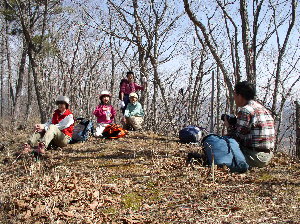 最初に登ったのは85年4月で、まだ、ロッジができる大分前だった。西の海岸寺峠からやや長い尾根伝いにいったが、ロッジを利用するようになってからは北側の樫山峠まで車に乗せてもらって楽をするようになった。四季の雑木林が美しい山で、展望は山頂から少し東によった岩峰にあがると立派なものである。南に大尾根峠まで尾根を歩くのもよいだろう。尾根上のところどころには露岩があり、そこには昔の信仰登山の石碑が見られる。ただし大尾根峠近くになると踏跡もあやしくなってくる。それを承知の方には、お勧めコースの一つだ。 |