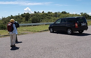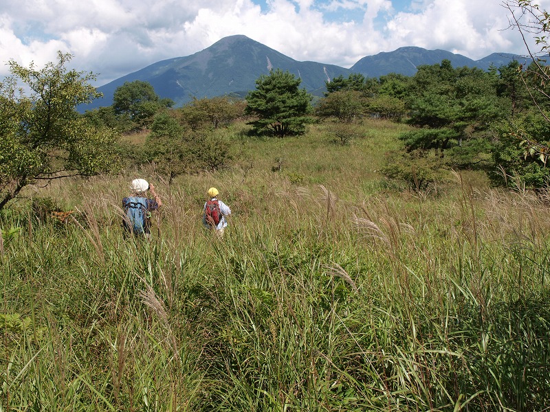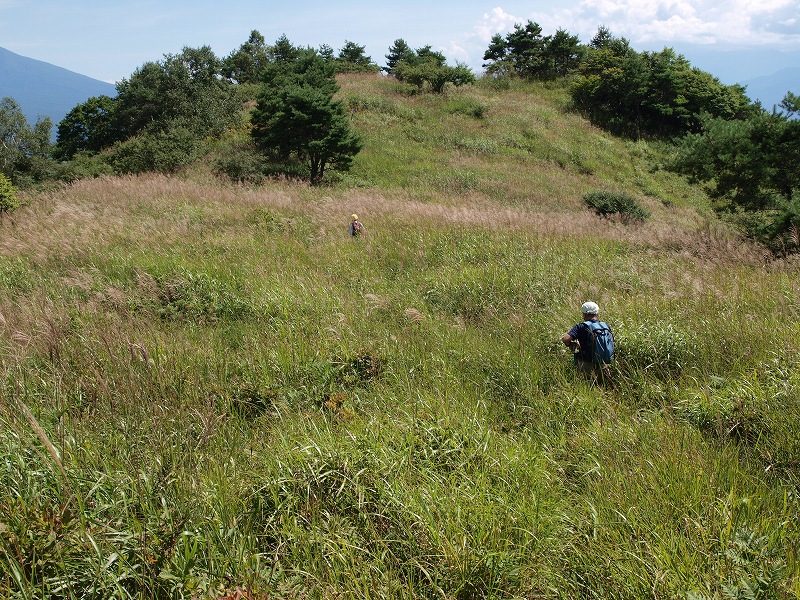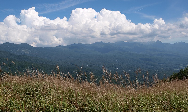 | 山の上からの嫌がらせは、昔は葉書、今は携帯電話へと進歩した。なにしろルンルン調子の言いたい放題を、しかもリアルタイムで聞かされるのだから、たまったものではない。 この夏は猛暑にあえぐ8月26日の午後、なにもする気も起こらずに、ただ寝っ転がってブックオフの100円文庫本は悪女物のミステリィで時を過ごしていると、そのクライマックスに合わせたかのように電話がなった。 「わたし、國見。いま櫛形山の上。霧がまいてとても涼しいの。さっき南アルプスも見えたし、カモシカが目の前をとんでいった。…… ちょっと待って。いま、泉さんに代わるから」 なんたる痛撃。女史お二方はいい歳をして、やってくれるではないか。天界極楽境からの実況放送を聞いたとたん、こちら下界の暑さは一段と増し汗がふきだした。 8月30日は家人の誕生日で、毎年その前後にロッジに行くことにしている。長沢君一家もお祝いしてくれ、ことのほかの歓待に預かるのが慣例である。今年はいつにしようかと考えて、23日からの週は私には医者の予約が3日あり、家人も医者の予約やら生協があって駄目なので、その後の週が変わってからの30,31日にすることにした。ところが國見、泉のお二方は26,27,28日の3日間でロッジへ行くのだといい、國見さんにいたっては「お医者の予約なんて延ばせばいい、わたしたちといらっしゃいよ」とのお誘いだ。 この、なんとかの深情け的勧誘に一時は心もぐらついたが、結局は勘弁してもらって、やはりこちらは予定通りの30,31日に行くことにした。その挙句の、日にちのずれに悪乗りしたのが26日の電話である。 30日は11時少し過ぎ、小淵沢駅には長沢君がいつもと違う黒塗りのワゴン車で迎えに来ていた。 ![]() 「今日はどこへ行くの」と問えば、カシガリ山だという。近頃はなにごとも長沢君に任せておけば間違いないと、いつも行き先はそちら様しだい。霧ヶ峰の一角のカシガリ山は彼も初めてだそうだが、水平移動の所要時間も短い楽な山だと聞いて「あぁ、それはいいねえ」。なにしろ本日は当人もびっくり旦那もびっくりの、家人は傘寿の誕生日で、山も、そんなにきついところは止めたほうが無難なお歳になっている。加えて、そろそろお昼近くの遅い時間なのだから、まぁ、3、4時間の軽い歩きがちょうどいいところだろう。 助手席に乗り込んで、道々、興味しんしんのこの異な車の由来を聞けば、先日の櫛形山からの電話がゆえの因果と知って、思わずにんまり顔になった。なるほど、そういうわけなのか。そこで、その辺のいきさつは私の文章ではなく、とくに長沢君にお願いする一文によって知っていただくことにしよう。そのほうが意を尽くしているに違いなく、「長沢さん、加えて翌27日の高峰山登山の分もお忘れなく」。(文末に掲載) さて、ここで肝心のカシガリ山の説明をしておく。霧ヶ峰の主峰というべき車山(1925m)の真南からやや東に振れて約2.5kmのところにあり、標高1616.4mの3等三角点のある山だ。そして、その間にはビーナスラインが走り、その1680mほどのところに車をとめて歩き出せば、途中いくらかの起伏があるにしろ、確かに長沢君のいうように水平移動で達することができる。 カボッチョ(1681m)をご存知ならば、その東南隣りの山と心得ていただければよい。なお、カシガリなる奇妙な山名は南麓の米沢辺からだと傾いて、つまりカシイデ見える山容によるとのことだ。 ![]() 天気は上々、時間とともに一段と大気の透明度はあがり、山々もくっきりと見えてきた。それに、この高さまであがってしまえば、日差しはきついものの吹く風は爽やかで心地よい。長沢君、今日もいい山に連れてきてくれて、ありがとう。行く手には、私好みの草尾根が気持ちよさそうに伸びている。 眺めもいい。蓼科山は大きく、進むうちに八ヶ岳の諸峰も雲から出てきた。 遅い昼食の場所を木陰に選べば、すっと涼しい風が吹き抜けていく。ゆっくり腰を下ろしての食事がてら、先日の國見、泉女史のロッジ山行の3日間をうかがえば、コンビニのオカズパンもいっそう味が増すというものだ。それだけに、ここで國見さんなり泉さんなりに電話をすれば効果絶大だろうと誘惑に駆られたが、明日の荒天を恐れてぐっとこらえた。 ![]() 後日、2万5千図「霧ヶ峰」「大塩」を見ると、私たちがたどった尾根(それほど顕著な尾根とはいえないが)には、一応破線が記してある。それどころか一時は車を通したのではないかと思われる轍の跡もあったが、今はそのほとんどが草にうもれて足探りの個所もあった。これが、また、さらによろしいと思う。「いいところだねぇ」を繰り返した。 約1時間半で下り気味に達した山頂は狭く、叢に囲まれて眺めはないが、ここまでの過程に十二分に満足して不満はなかった。 帰り道はやや登りになる。車山を正面にしながら往路にも劣らない眺めが得られた。蓼科山から北八ツ、南八ツへと連なる稜線が湧きたつ雲の下にずらりと峰を並べ