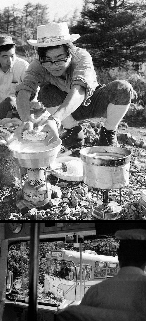 中 将監峠で、カンカン帽の残間雅秋君が昼の食事支度をしている。左がホエブス(ガソリン使用)、右がプリマス(石油使用)のコンロ。ガスコンロに変るのは、このあと10年くらいだと思う。同行はみな奥多摩山岳会の友人で、残間君はまだ学生だった。彼は勤めを定年退職したあと、偶然だがロッジ山旅のごく近くに大きなログハウスを建て、これから大いに遊ぼうという矢先に亡くなってしまった。もし、いまも存命ならば、こちらはロッジに泊まりかたがた、彼と多くの山にいっているだろう。仲良くしていた、若い友人の1人だったのにと惜しまれてならない。