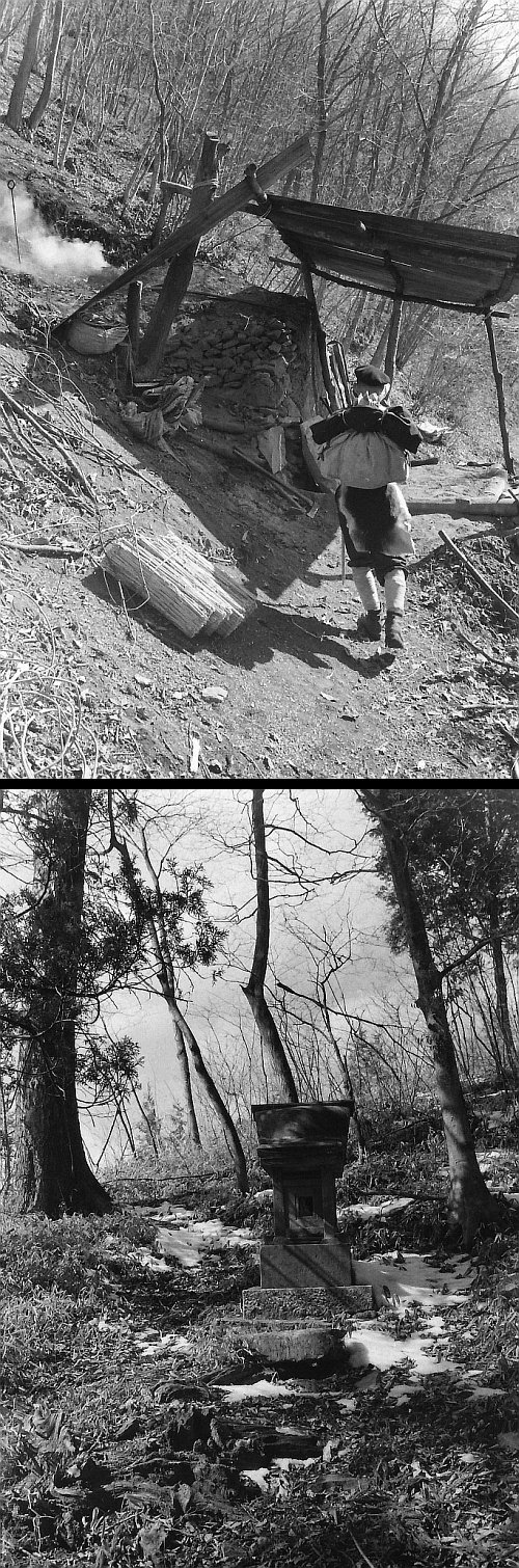 中 この頃になると、すでに現役の炭焼窯は少なくなっていた。私が奥多摩や大菩薩を歩き始めた昭和20年代後半から30年代の半ばくらいまでは、煙と臭いたちこめる炭焼き窯を数多く見かけたものである。ときには炭焼きのおじさんと世間話、こちらがお菓子をだし、向こうがお茶を入れてくれたこともあった。この時は、すでに珍しくなっていた炭窯を一写、ついでに望月さんの尻皮、ゲートルもなかなかのものです。