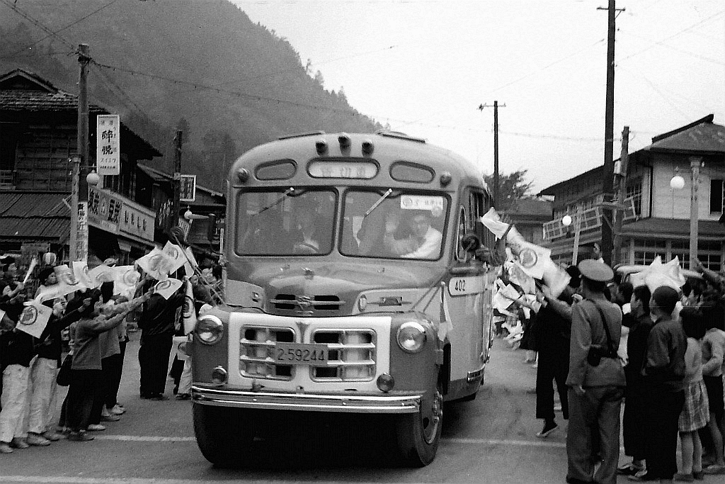 上.昔懐かしいポンネットバス 奥多摩町町長はこの大会の名誉会長に任じられ、町民あげての大歓迎だった。氷川のメインストリートのこの辺も、今は「此処も昔の此処ならず」の変り方である。