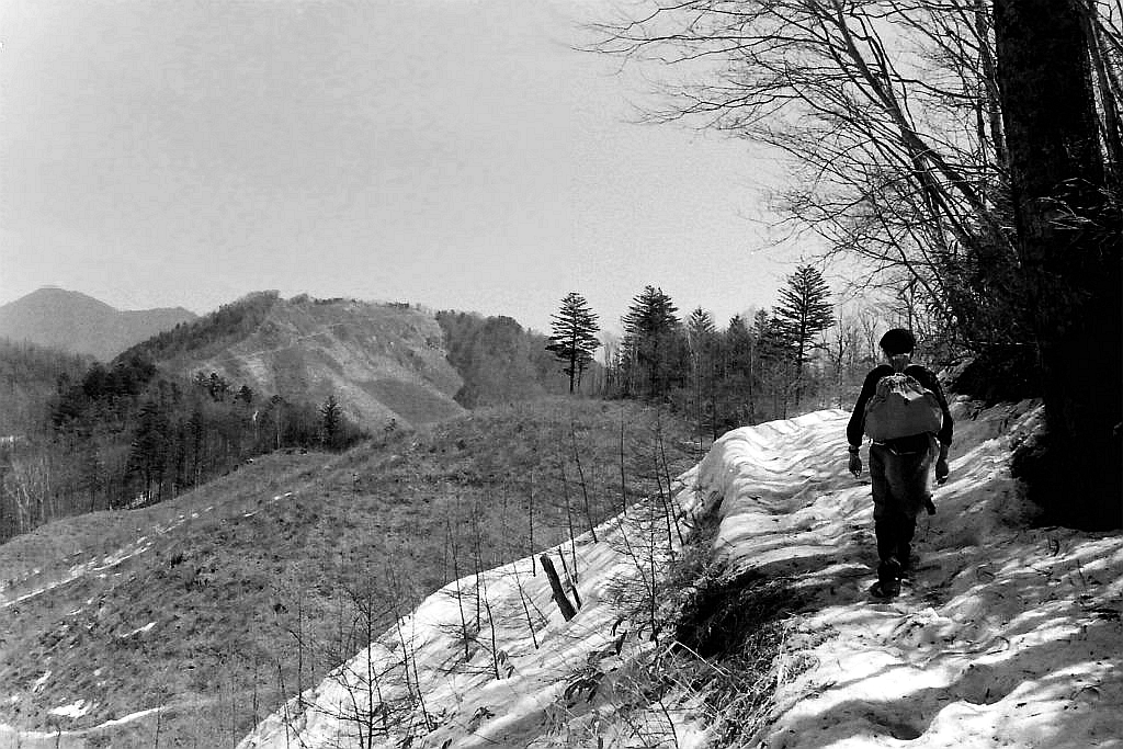 上 水源林道から眺める黒川鶏冠山。この頃は落葉松の植林が始まったばかりで眺めがよく効いた。北面には雪が残っていたが、大菩薩嶺を境に南面には雪はまったくなかった。人物は山田さん。