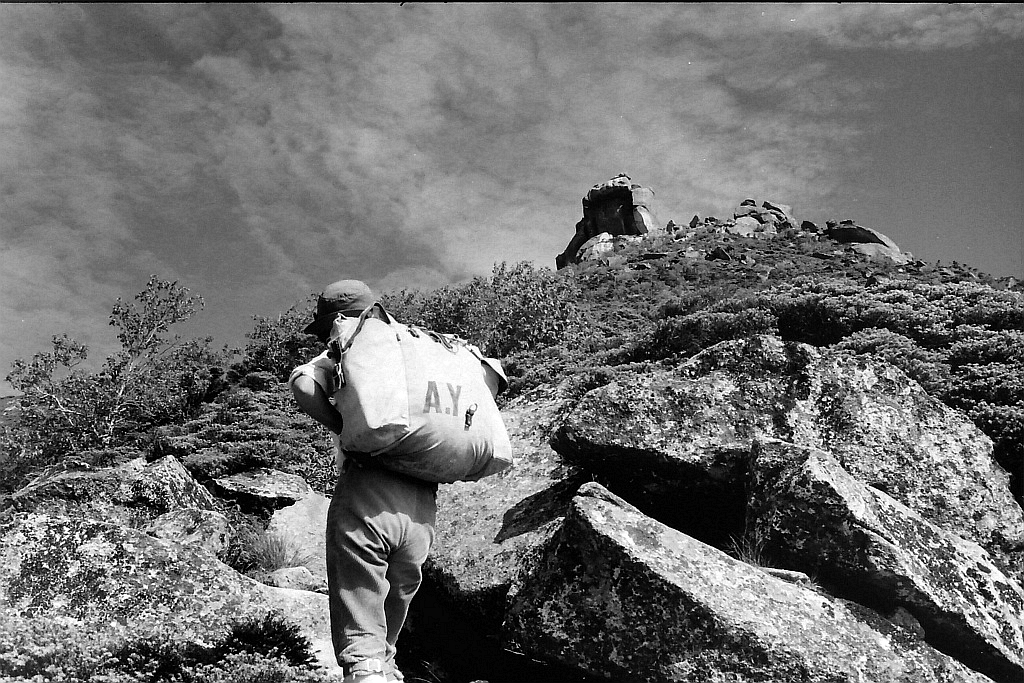早朝の電車で甲府、バスで金桜神社、そこから猫坂を越え下黒平、上黒平へと歩いていったのだが、真夏の昼日中で暑いのなんのって。気息奄々だった。その日のうちに御室小屋までいくつもりだったが、とてもそんな元気はなく、水晶峠手前の沢っぷちでテントを張ってしまった。なお、上黒平には古くからの藤原(家か屋が付いたかも知れない)旅館があり、そこの売店にアイスクリームがあったのには大感激だった。