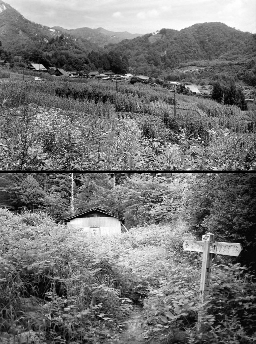 中 黒平には下(しも)と上(かみ)の集落があるが、これは下黒平の家々だと思う。1997年4月、寺田政晴君と観音峠から曲ヶ岳往復ののち桝形山、1700b峰をへて長窪峠道(廃道に近かった)を下黒平へくだったことがあった。その折、家々の造りは今風になっているにしろ、この山村風景を私は懐旧の思いで眺めた。