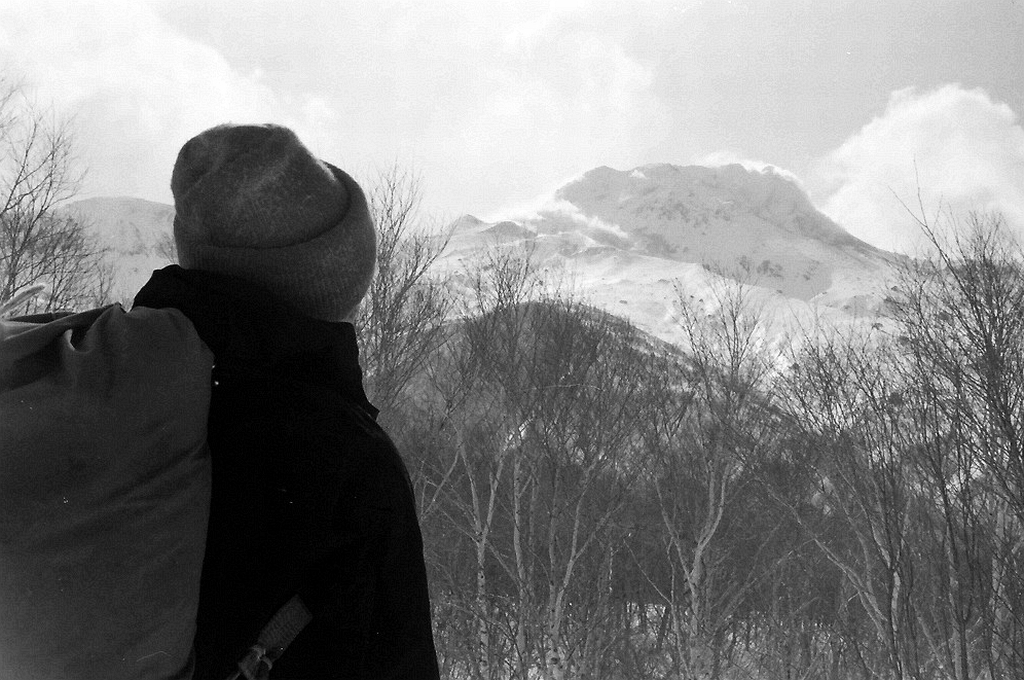 中 初日はホワイトアウト気味の空模様だった。大丸温泉から峰ノ茶屋へ登る途中の1枚。