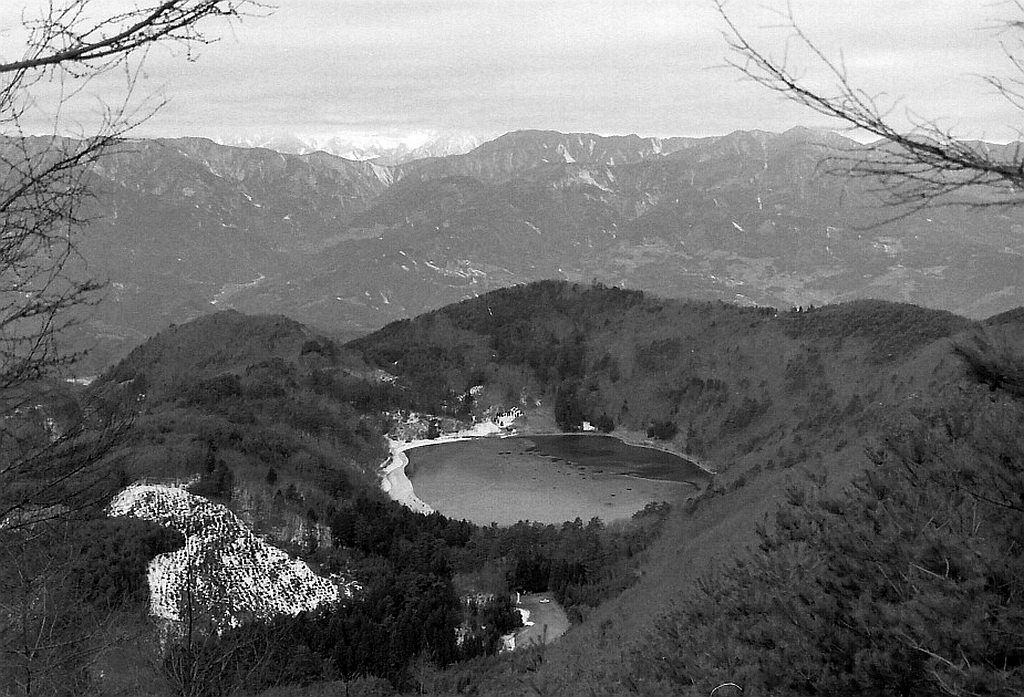上 このあと、私は2度蛾ヶ岳に登った。1997年1月には山村正光さんの先導で、大森久雄、泉久恵、山本健一郎の諸兄姉とやはり水明荘に泊まって登り、2011年1月にはロッジ山旅泊の翌日に長沢君の車で湖畔まで駆けあがって登っている。97年のときは無風快晴の好日、山頂で山村さんが鮭の粕汁を作ってくれたのが忘れられない。長沢君の車で楽をした3度目の蛾ヶ岳では陽は差すものの寒い一日で、南アルプスは雲に隠れていた。