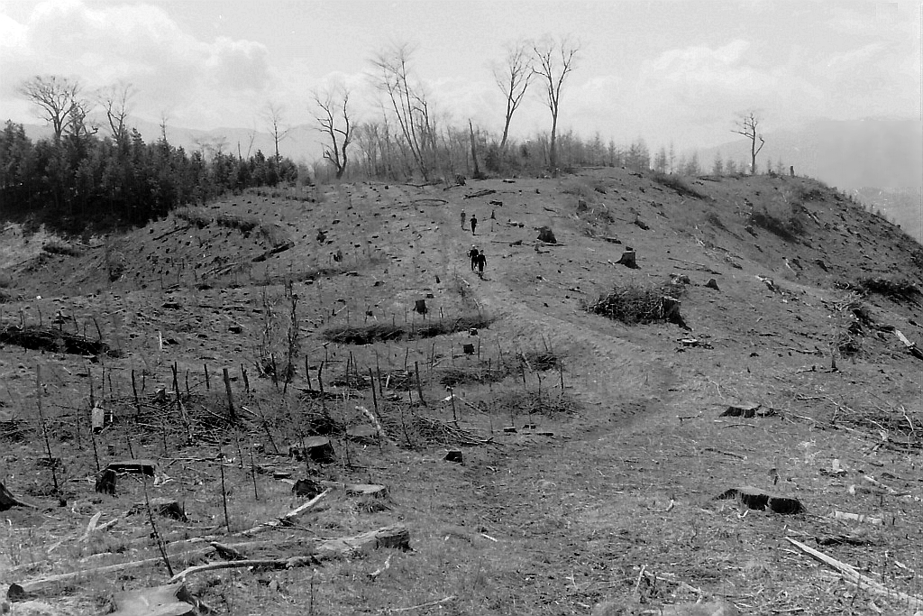 上 この時は余沢から鶴峠にあがり、そこで牛ノ寝通りの尾根にとりついた。今、寺田君のガイドを読むと、この尾根のほとんどは自然林に覆われ、新緑や紅葉の季節がよいとあるが、当時は、まだ伐採直後の一面切り開かれたところが何箇所かあった。尾根を乗っ越す松姫峠の車道ができたのも、ちょうどこの頃だ。折りしも私たちの目の前をアベックを乗せた車が土煙をあげて疾走していったのには呆気にとられ、「馬鹿にしている」としかいいようがなかった。
