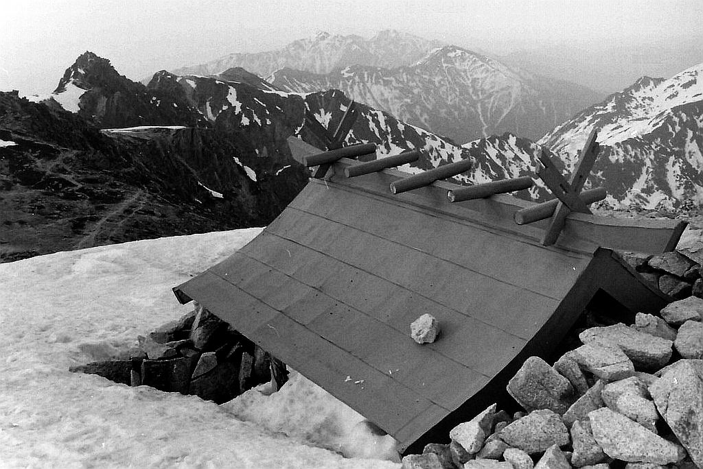上 駒ヶ岳山頂の神社が半分雪に埋まっていた。左に宝剣岳が見えている。