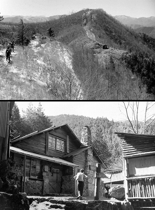 下 今はなき獅子口小屋。大丹波川の源にあり、洒落た造りの小屋だった。長く木宮丈助夫妻が入り、清流で育てたワサビの山葵漬けが名物だった。川苔山は日帰りでも楽に登ってこられる山だが、あえてこの小屋に泊まり、蕎麦粒山まで足を伸ばしたりしたものである。1973年暮れには名古屋の日本山岳会会員故川北仁さんとも泊まっている。惜しいことに木宮夫妻が高齢で小屋からおりたあとしばらくすると建物までも解体され、今は獅子口小屋跡の地名が残るだけである。