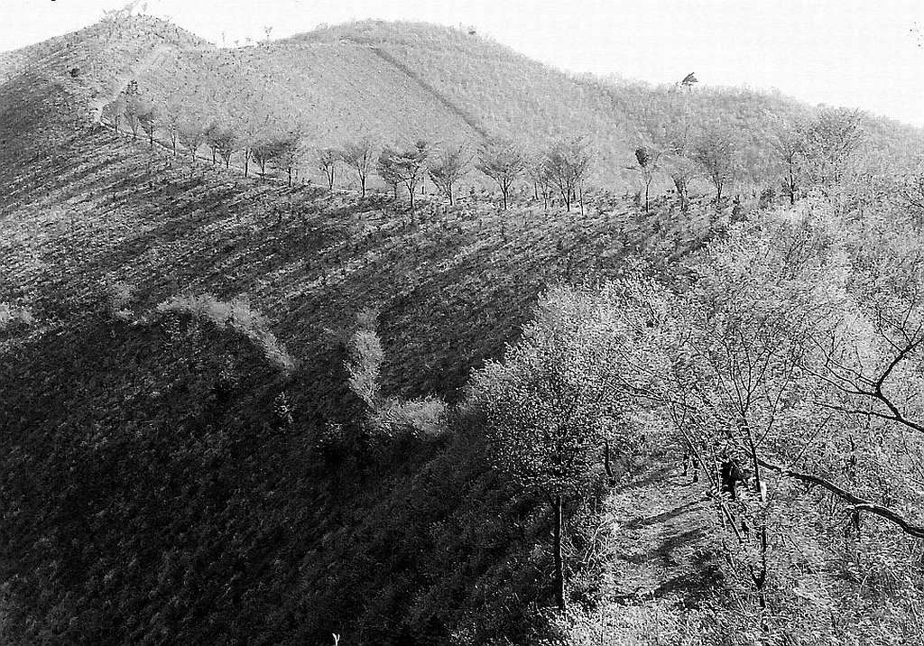 上 三国山、三国峠から南にくだる尾根。桜並木もまだ育たずに、明るい道が続いている。今はこれらの桜の木は大きく育ったが、同時に、それを囲んで周りの木も伸びて薄暗い感じの道になってしまった。歩いていて少しも面白くない。