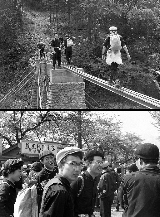 下 1956年、日本隊がヒマラヤの8000b峰マナスルの初登頂に成功したのをきっかけ登山ブームが始まった。ここ武蔵五日市駅前も、毎休日の朝ともなればバスを待つ登山者で黒山のような人、人、人。わが奥多摩山岳会では横目の秋山君(多分向こうにカワイコチャンでもいるのだろう。秋山君はカワイコチャンが大好きだった)を中心に、その右には鈴木さん、左端には程なくして「タケサンのオクサン」と呼ばれるようになる女性が写っている。