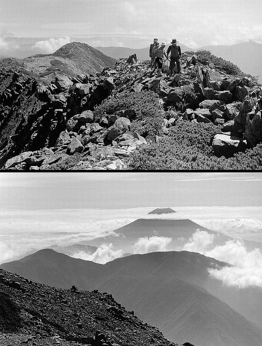 上 聖岳には16日の朝8時50分に登りついた。水野さんが中村さんに山を説明している。その後ろには望月さん、山本さん。山田さんはたぶん岩陰で小用でもたしているのだろう。