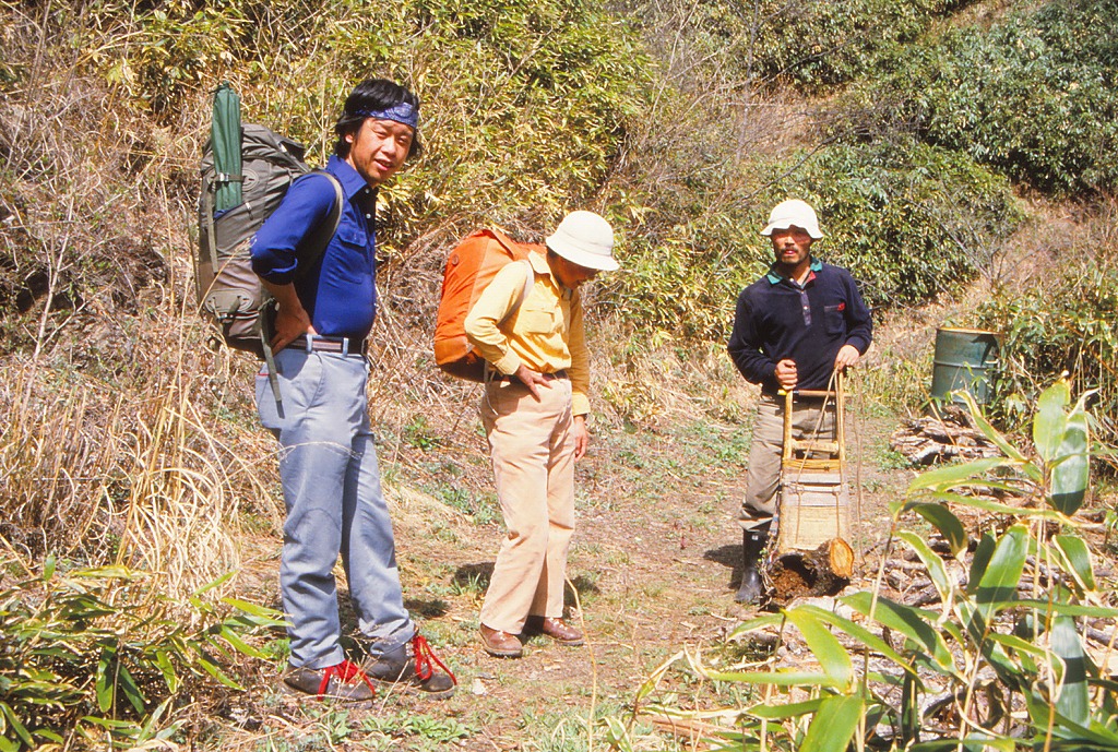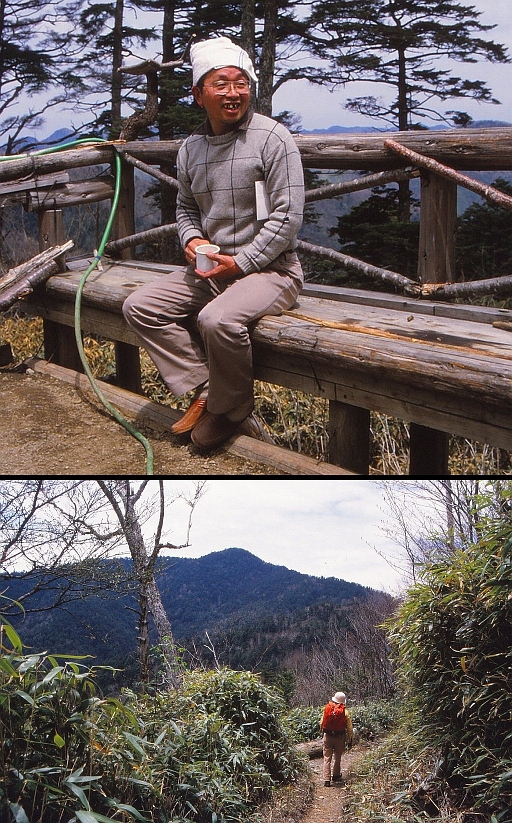 さて、ここで写真をご覧いただこう。これは今から29年前、寺田政晴君同道の山行である。日原を振り出しに、ヨコスズ尾根を一杯水避難小屋に登ったあと、長沢背稜を歩いて酉谷小屋前の広場で幕営。翌日は雲取山荘に立寄って新井信太郎さんとしばし歓談ののち、雲取山を越し石尾根のブナ坂から鴨沢へくだった。岡部仙人とは小雲取山の巻き道をおりてきたところ、雲取奥多摩小屋の少し上で出会ったと覚えている。彼は切り出した薪材を小屋へ運ぶ途中だった。