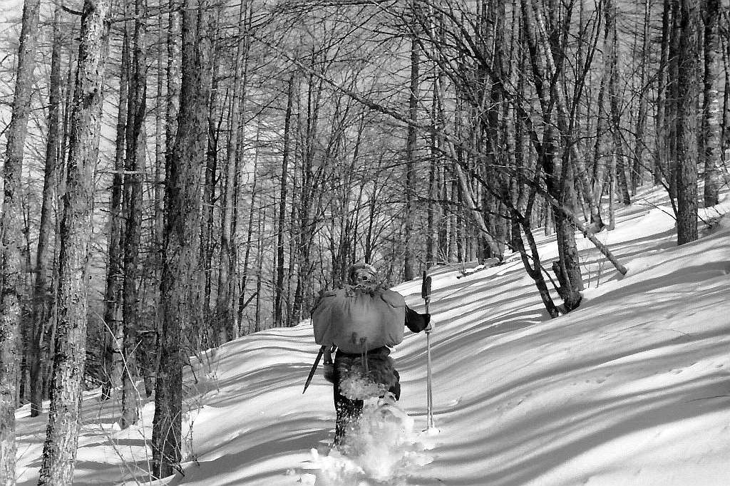 中 丸川峠。この写真で見ると雪は30~40㌢といったところか。この程度の雪でも1歩1歩のラッセルとなると決して楽なものではない。