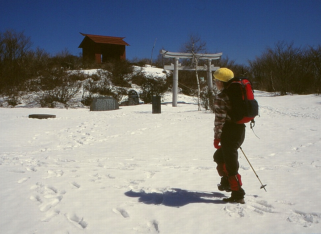 上 広い山頂は一面雪に覆われ、麓の田沢、茂原、葛原の村人それぞれが神を祀る3つの神社が点在していた。田沢から登ってきた私たちが詣でるのはやはり田沢の神社であり、それが一番高いところにあるのも嬉しかった。