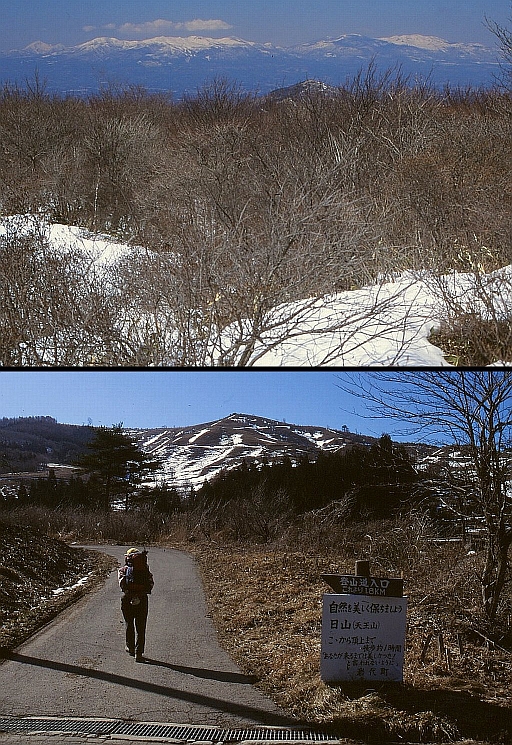 下 初めのうちは正面に日山を眺めて、牧場の中を登っていった。下山も同じ道をたどって田沢におりたが、バスを待っているときに1人のご婦人が話しかけてきて、「どこから来たね」。「東京から」と答えると、「今日の東京は大変だよ」。郡山の駅で夕刊を買うと、こんなことがあってよいものかという大事件が報じられていていた。以後の毎年、3月20日が来てオウムのサリン事件が回顧されるたびに、私は日山を思い出している。よい山で、楽しく登ってきただけに、その悲惨さがなおさらだ。