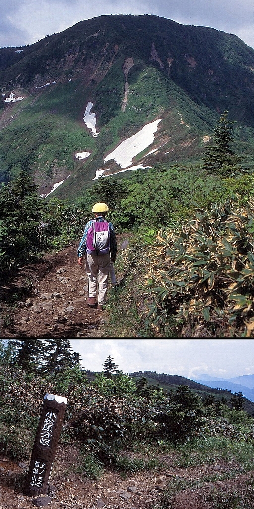 下 小松原湿原への分岐点。1971年9月の時は、赤湯温泉と苗場山頂上の小屋に泊まった3日目、この分岐から小松原湿原に遊び、逆巻温泉へくだった。小松原湿原通過が丁度お昼ごろになり、インスタントの笊蕎麦を食べたのを覚えている。中野英次さんが一緒だった。