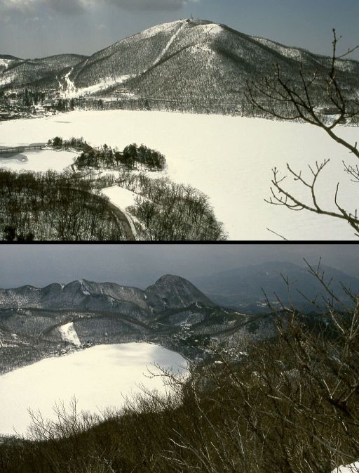 中 登る途中からの大沼と地蔵岳1674㍍。後日、この山も近くの長七郎山1579㍍と合わせ、季節風吹きすさぶ寒い冬の日に登りにいった。