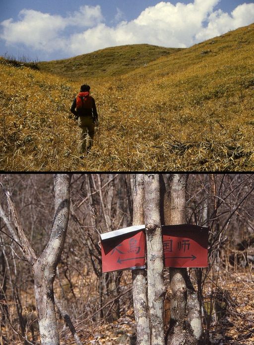 下 登りついたところは大丸戸2234㍍から南に大烏山に続く尾根上、三枚笹より少し下の鞍部で、ここには大烏山と国師岳を指す古びた道標があった。この尾根にはかすかに踏跡が見られた。道標があるくらいなのだから、以前はもっと往来のある尾根道だったに違いない。それは徳和から大久保峠、大久保山、東御殿、大烏山、三枚笹、大丸戸、ゴトメキ、白桧平、奥千丈岳をへて国師岳へ通じる道として原全教さんの『奥秩父』(朋文堂/昭和17年)の地図にも破線が記されている。