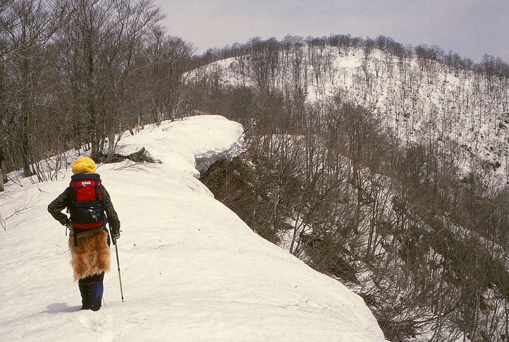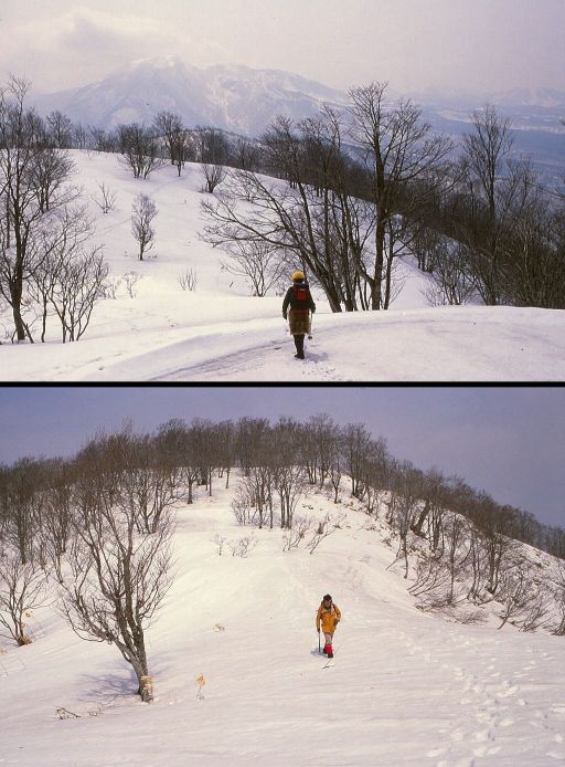そこから湖の南岸沿いに実線の車道がつけられているので、それを少したどったあと頃合いを見て山に取り付こうという計画である。秋元湖の水面が736㍍、山との差引きの標高差は500㍍もなく、そうは面倒もあるまいとの目算どおりに3時間もかからずに登ることができた。雪の尾根歩きが楽しく、辺り一面を賞味しつつのゆっくり登山でこの時間なのだから、さっさと歩けば2時間ほどもかかるまい。下りは千貫の集落へ雪上散歩と磐梯山の眺めを楽しみながらの、これも牛歩の歩みだった。