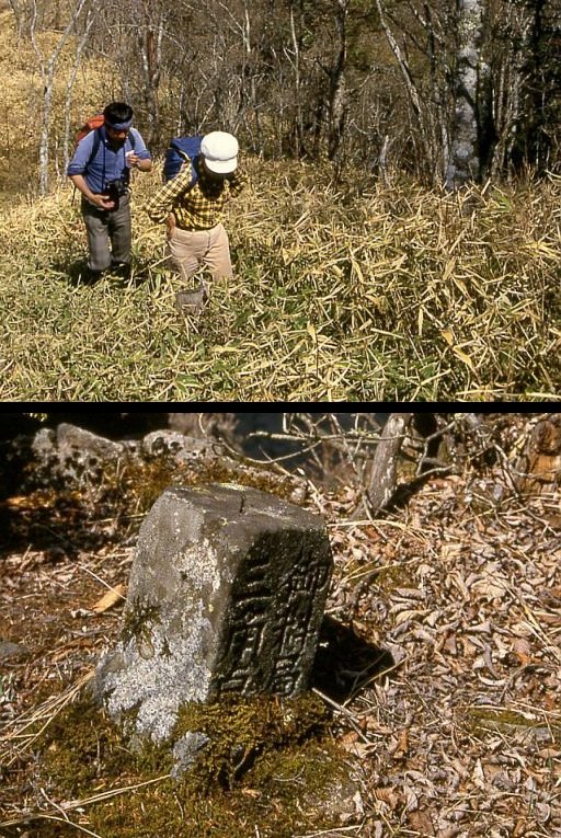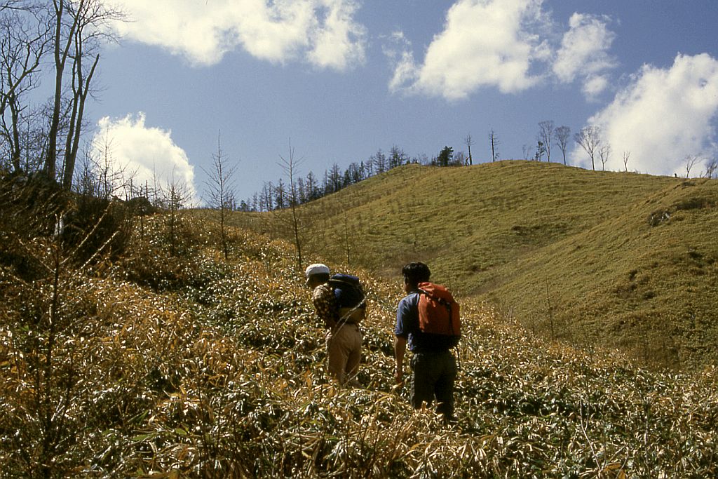塩山駅からタクシーで乙ヶ妻集落跡へあがってからは、大久保峠‐東御殿‐1772.7㍍三角点峰‐大烏山(1860㍍の標識あり)‐琴川沿いの車道杣口3号橋と歩いた。五月晴れの好日、いつもいつもの寺田政晴君との中央沿線日帰りの山歩きであり、ところどころの笹尾根も気分よろしく、忘れがたい1日になった。この写真を見れば、その楽しさはよくわかっていただけるだろう。 さらには山をおりてからの車道歩きにうんざりしていると、後ろからきた小型トラックが止まってくれたとは大幸運。それも「乗っていけば」との声の主は柳平のなじみの民宿鳥居峠荘の若旦那で、町の老人会に行っているおじいさん、おばあさんを迎えに行く途中ということだった。 上、中 大烏山への尾根だが、30年もたった今、こうした笹原はどうなっているだろうか。 下 大烏山の御料局三角点。昔、皇室の財産であった森林を管理していたのが宮内庁林野局で、これはその基準点として設けられたもの。 山梨県には御料林が多かった。 (長沢註) (2015.7) 中、下の写真はクリックすると大きくなります |