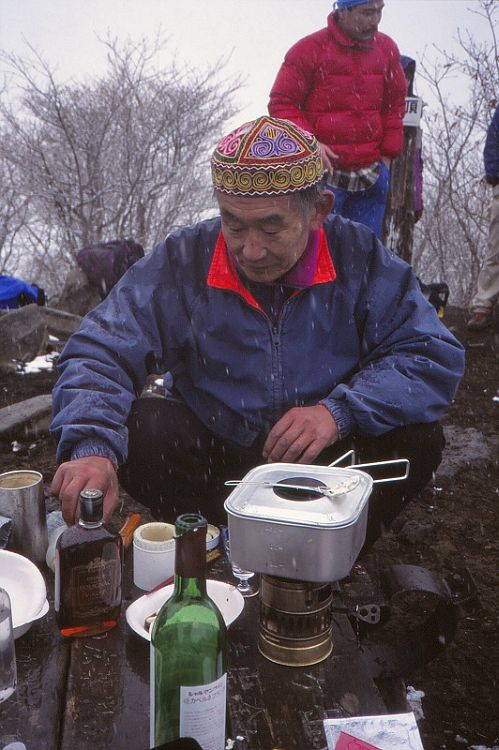 ビデオ版『深田久弥の日本百名山』全20巻(企画・製作・発行=山と溪谷社/映像提供=NHK)は売れに売れたらしい。仄聞するところによると、これで山と溪谷社では時ならぬボーナスが出たという。私にも、その大菩薩と雲取山の取材に同行してくれないかとの話があって、1994年の5月13〜17日までの5日間付き合うことになった。泊まりは大菩薩は介山荘、雲取山は三条の湯と雲取山荘2泊、ご苦労賃は3万円を頂戴した。これが高いか安いかは、皆様のご判断に任せよう。それはそれとして、この茅ヶ岳登山は深田久弥さんの終焉の地を詣でるという、NHK放映の「日本百名山」のダメ押し的番組の撮影が目的だった。参加は深田さんのご長男森太郎さんと山村正光さんが本命で、私はあらずもがなの付けたり。あいにくの小雪が舞うような寒い日だったが、山頂では山村さんが暖かい鍋料理をしつらえてくれてありがたかった。補記